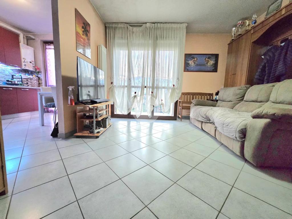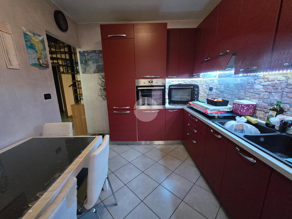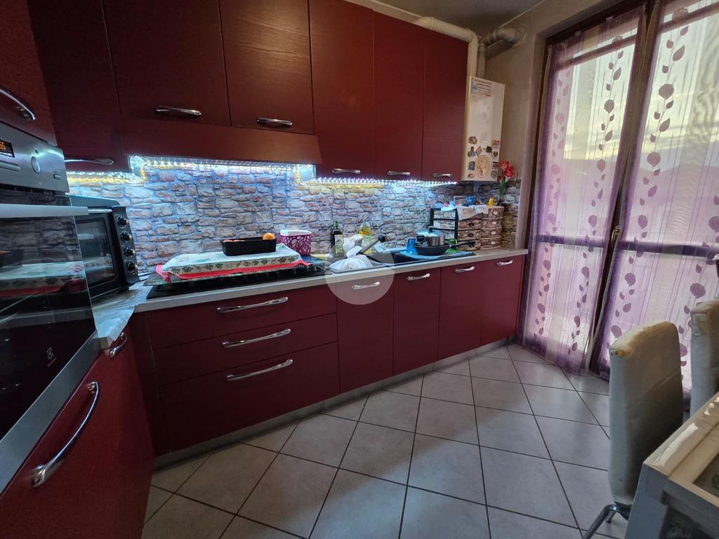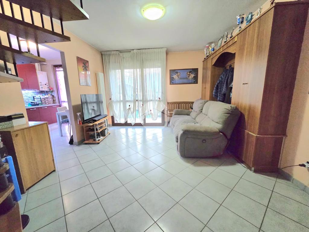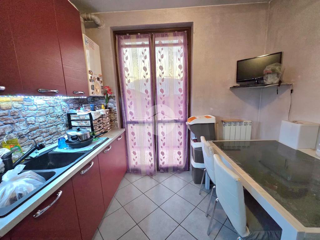 L’ingresso si apre su un accogliente soggiorno, esposto a ovest, che permette l’accesso a un terrazzino con una vista incantevole sulle montagne, perfetto per rilassarsi all’aria aperta. La cucina, separata e abitabile, offre uno spazio comodo per pranzi e cene in famiglia ed è collegata tramite una porta finestra a un balcone, pratico e riservato.